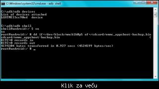Druze radio sam preko aplikacije terminal android, znaci prvo sam radio iz cmd, a posle iz aplikacije! Nece izbacuje mi istu gresku kao i u CMD! I ova slika, je od back-up, to kod mene i uspe! Ali nece druga komanda koju si napisao u postu! Javi se na PM, da ti napisem jer izgleda nisi citao sta sam pisao ovde. Uradio sam taj proces isto. Znaci sve tutorijale koje sam nasao na interentu sam probao. I taj tvoj sam citao i probao pre neki dan, i juce sam probao opet! Nisam lud, znam sta si mi rekao. Evo ti slika.