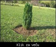 A ovo je slika jednog od dva čempresa (ili pačempresa), mislim da se radi o Elvudi, ali nisam siguran, jer sam čitajući na netu vidio da ima baš mnogo vrsta i podvrsta. Ova dva čempresa sam posadio u ponedeljak i zalio ih sa oko 30-40 litara vode. U utorak i srijedu je padala kiša, a četvrtak, petak i danas sam ih zalio sa po 15-tak litara vode. Da li je to dovoljno i koliko dugo tako treba da nastavim. Čempresi su veličine oko 70 cm, i zasadio sam ih zajedno sa postojećim busenom. Kad najranije mogu biti siguran da su se uspješno primili i da će nastaviti normalan rast. Evo slika jednog od dva.