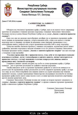Citat:Novim predlogom Sindikata zaposlenih policije moglo bi da se desi da onaj kome neko provali na posed može da se odbrani, a da za to ne odgovara! Iz policije su, naime, uputili dopis Vladi Srbije sa predlogom da se po hitnom postupku usvoji zakon o zaštiti privatne svojine, koji bi bio po ugledu na onaj koji postoji u SAD.