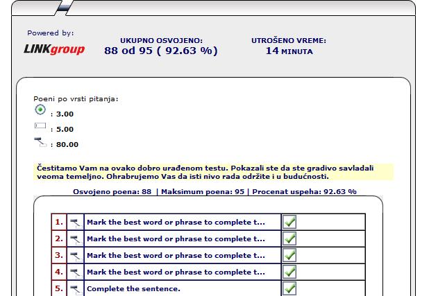 Nisam bas bila koncentrisana na nekoliko poslednjih pitanja, ali dobro je to sto sam prepoznala na koja pitanja necu tacno odgovoriti. Znaci, fraze su mi slaba tacka, gramaticke greske nisam pravila..juupii Smile