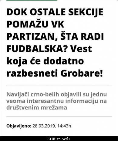 Citat:FK Partizan posle pisanja medija ipak odlučio da najavi uplatu donacije VK Partizan u iznosu od 50000 dinara! [Link mogu videti samo ulogovani korisnici]
