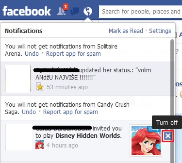 Dakle dobijete zahtev za neku igricu i to izgleda kao na slici ispod. Kad postavite kursor miša na zahtev, pojavi vam se X u gornjem desnom uglu (Turn off) i kliknete na njega: