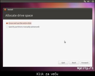 Slučaj u kome već postoji drugi operativni sistem ćemo obraditi naknadno. U ovom slučaju (prazan disk) možete slobodno izabrati prvu opciju i instalacioni program će automatski izdeliti disk na odgovarajući način. Ovu opciju NE KORISTITE ako je drugi operativni sistem već instaliran (bilo da je u pitanju Windows, Linuks ili bilo koji drugi OS). Ukoliko se na disku nalaze vama bitni podaci, preporučljivo je napraviti rezervnu kopiju na izmenjive medije s obzirom da će ovaj tip instalacije obrisati SVE podatke koji se već nalaze na disku.