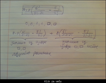 Međutim, imaš grešku u prvom sabirku. Ako si već prilikom razmatranja broja načina na koji možeš odabrati one dve preostale cifre (koje nisu nule ili jedinice) vodio računa o njihovom redosledu (računao si ih kao varijacije bez ponavljanja i dobio 8⋅7), tada nije trebalo da u permutacijama s ponavljanjem te dve cifre posmatraš kao različite elemente. Jer, na ovaj način, ti si svaki od slučajeva računao dvaput, što znači da ti je prvi sabirak dvaput veći nego što treba da bude.