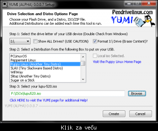 - Pokrenite aplikaciju. Odaberite slovnu oznaku USB diska. Iz liste podržanih distribucija (i ostalih stavki) izaberite neku. Kada označite, klikom na dugme Browse priložite pripadajuću ISO sliku. Birao sam Puppy 5.2 (onaj problematični).