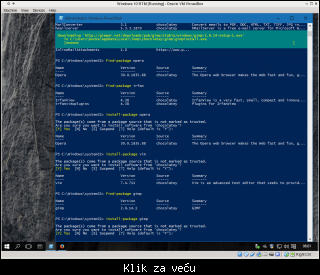 Na slici se vidi instalacija i pretraga za neke paketa uz pomoć Chocolatey "provajdera". Chocolatey je nezvaničan i nepodržan. Moraćete ga instalirati naknadno i podesiti "politiku izvršavanja" (ExecutionPolicy).