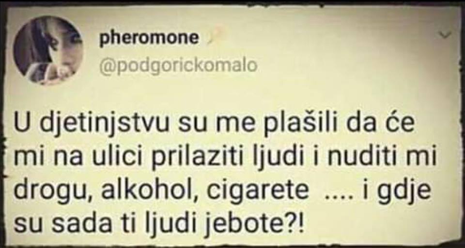Mi smo pušili iza WC-a u osnovnoj. WC je bio van zgrade škole i tamo smo se krili. Imali smo nekih 10 godina. Samo je bio problem ko će kupiti cigare, jer je to selo, a ona na trafici nas sve zna i reći će mami. Pa je išo onaj čiji deda puši. Pa smo i mi morali da pušimo to što i deda. Mr. Green Pa nas navato učitelj, dobili čvrgu, roditeljski, kući dobili šamare... Ali džaba. Bili smo uporni. I svi smo tih '90 hteli da budemo dileri, inflacija, marke i tako to. I pili smo ispred prodavnice - ALPINU iz flaše! Wink