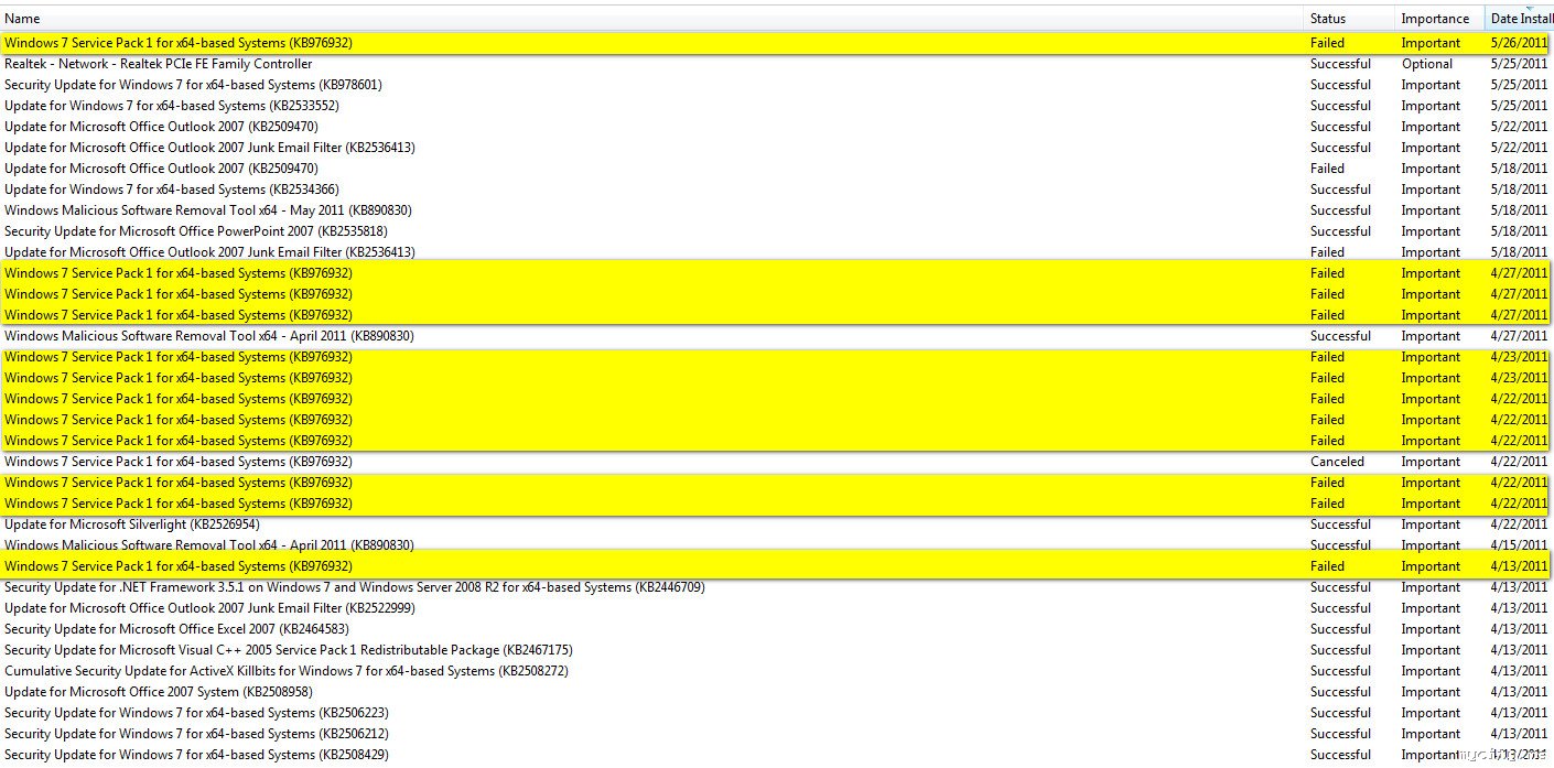 istorija azuriranja SP1 na W7 64bit