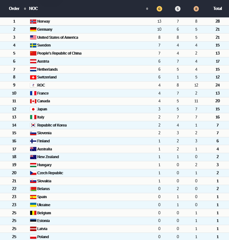 Olympic Medal Table Beijing 2022