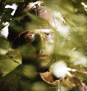 soldier hiding behind leaves wearing a camouflage helmet ~ 1496016